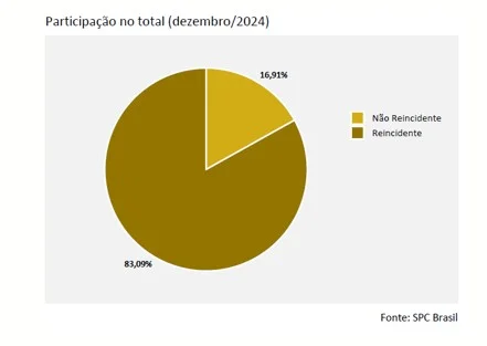 De acordo com o Indicador de Reincidência da Confederação Nacional de Dirigentes Lojistas (CNDL) e do Serviço de Proteção ao Crédito (SPC Brasil), oito em cada dez consumidores retornam para os cadastros de negativação menos de um ano após o pagamento de uma conta negociada. O Indicador aponta que, em dezembro de 2024, do total de negativações, 83,09% foram de devedores reincidentes, isto é, que já tinham aparecido no cadastro de inadimplentes nos últimos 12 meses.