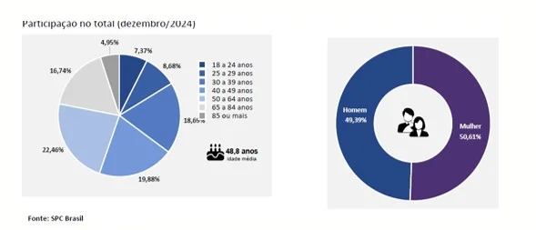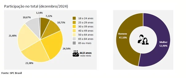 A abertura por faixa etária dos devedores reincidentes mostra que o número de reincidentes com participação mais expressiva no Brasil em dezembro foi da faixa de 30 a 39 anos (24,54%). A participação dos devedores reincidentes por sexo segue bem distribuída, sendo 52,90% mulheres e 47,10% homens.