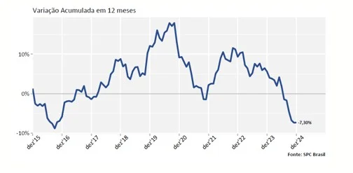 Os dados do indicador de recuperação de crédito mostram que, nos 12 meses encerrados em dezembro de 2024, houve queda de ‐7,30% no número de consumidores que conseguiram sair das listas de negativados. A comparação é com os 12 meses anteriores.