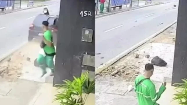 O agente de limpeza Erick Danilo Santos, de 26 anos, escapou de ser atropelado por um carro desgovernado na Avenida José Carlos Silva, no bairro São Conrado, Zona Sul de Aracaju. O caso aconteceu no início da manhã do último sábado (20) e foi registrado por câmeras de segurança.