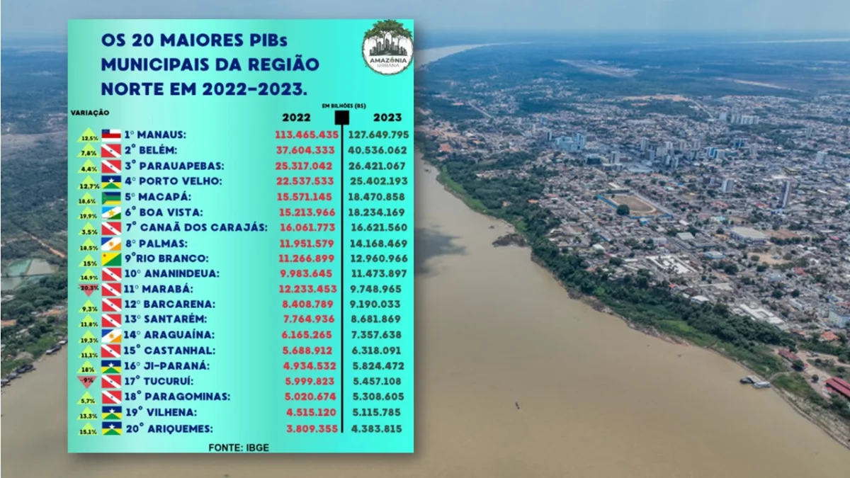 O ranking regional ainda é dominado por municípios do Pará e do Amazonas, com Manaus (AM) mantendo a liderança como maior economia do Norte. Em seguida aparecem Parauapebas (PA), impulsionada pela mineração, Belém (PA), Canaã dos Carajás (PA), outro polo minerador, e Porto Velho (RO), que fecha o top 5 graças ao avanço de atividades ligadas à geração de energia, serviços públicos e logística.