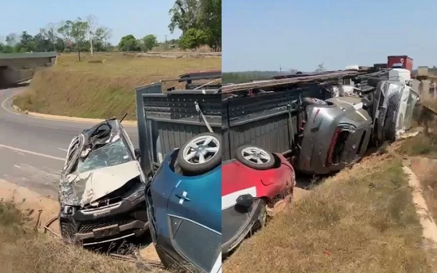 Caminhão-cegonha tomba e destrói veículos na BR-364 em Ji-Paraná