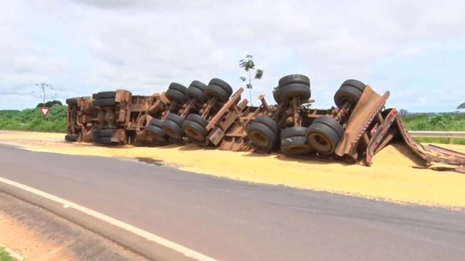 Na manhã desta terça-feira (18), um acidente foi registrado no Anel Viário de Ji-Paraná, envolvendo uma carreta carregada de soja. O veículo tombou após o estirante do último cavalinho se soltar, conforme relato do próprio motorista.