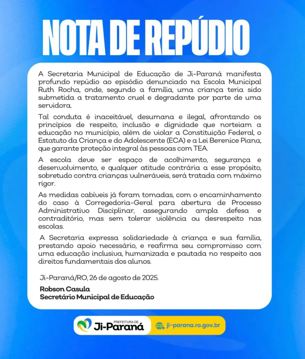 Na tarde desta terça-feira (26), a Prefeitura de Ji-Paraná emitiu nota de repúdio, afirmando que não compactua com atitudes dessa natureza e que acompanha de perto as investigações.