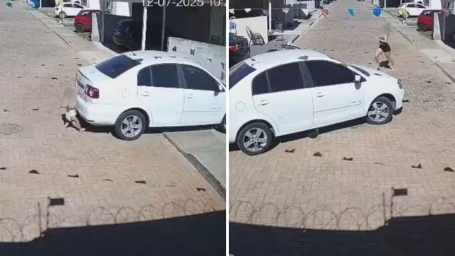 Uma criança de dois anos foi atropelada por uma vizinha em uma rua de um condomínio, em Goiânia. O menino não se feriu, segundo a motorista do carro, de 45 anos. O vídeo mostra quando o menino sai de casa, vai em direção ao carro e cai no chão.