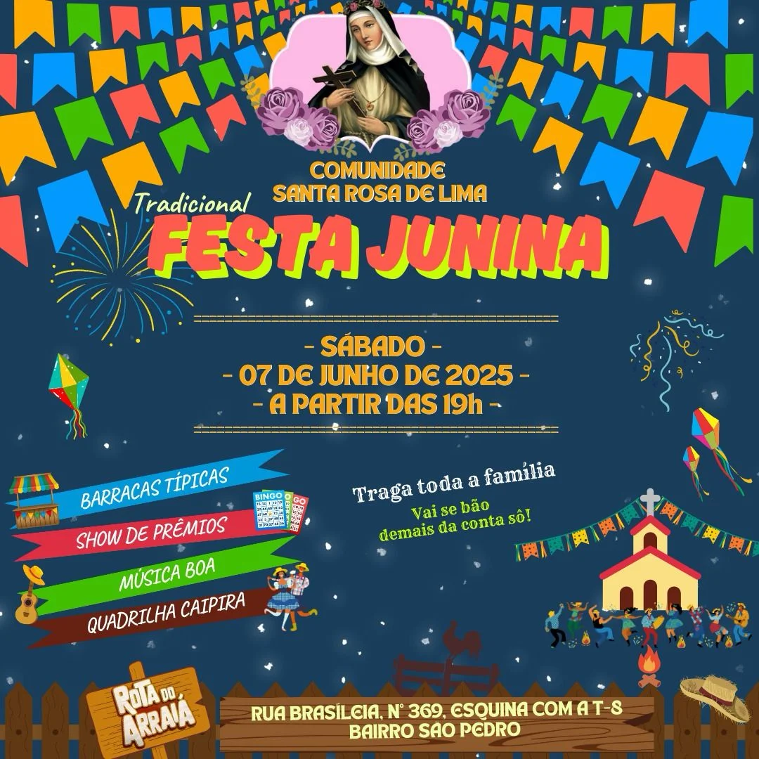 A Comunidade Santa Rosa de Lima, localizada no bairro São Pedro, em Ji-Paraná (RO), realiza no próximo sábado, 7 de junho de 2025, sua tradicional festa junina solidária. O evento terá início às 19h, na Rua Brasileia, nº 369, esquina com a T-8, e promete reunir famílias e moradores em uma noite de cultura, diversão e solidariedade.