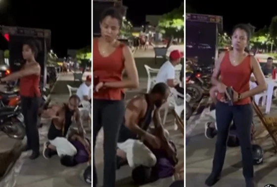 Nas imagens, uma policial civil aparece com um vestido estampado azul, encostada em uma árvore e segurando sua arma, enquanto outra policial contém a população que tenta se aproximar do homem, que estava sendo imobilizado por um terceiro policial.
