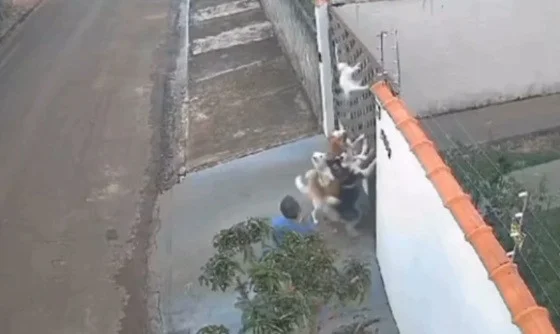 As imagens mostram que o gato tentou fugir dos cachorros, pulando o muro, mas não conseguiu e foi capturado pelos animais e mordido até a morte. O dono dos cachorros, por sua vez, não tentou poupar a vida do gato.
