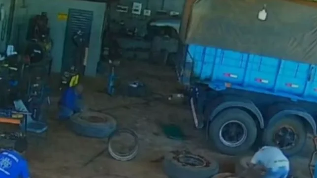 As câmeras de segurança registraram o momento da explosão. No vídeo, é possível ver o caminhoneiro, com uma camisa azul, inflando o pneu até ele estourar, o que gerou fumaça no local
