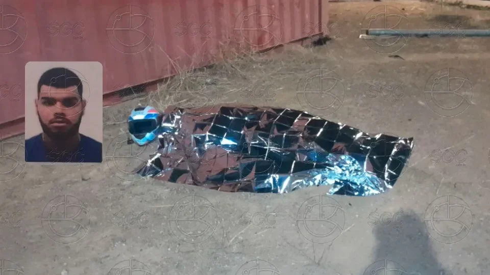 A força da batida arrancou uma placa de “pare” e deixou marcas visíveis no contêiner, incluindo a impressão do pé da vítima. A motocicleta foi destruída com a colisão.