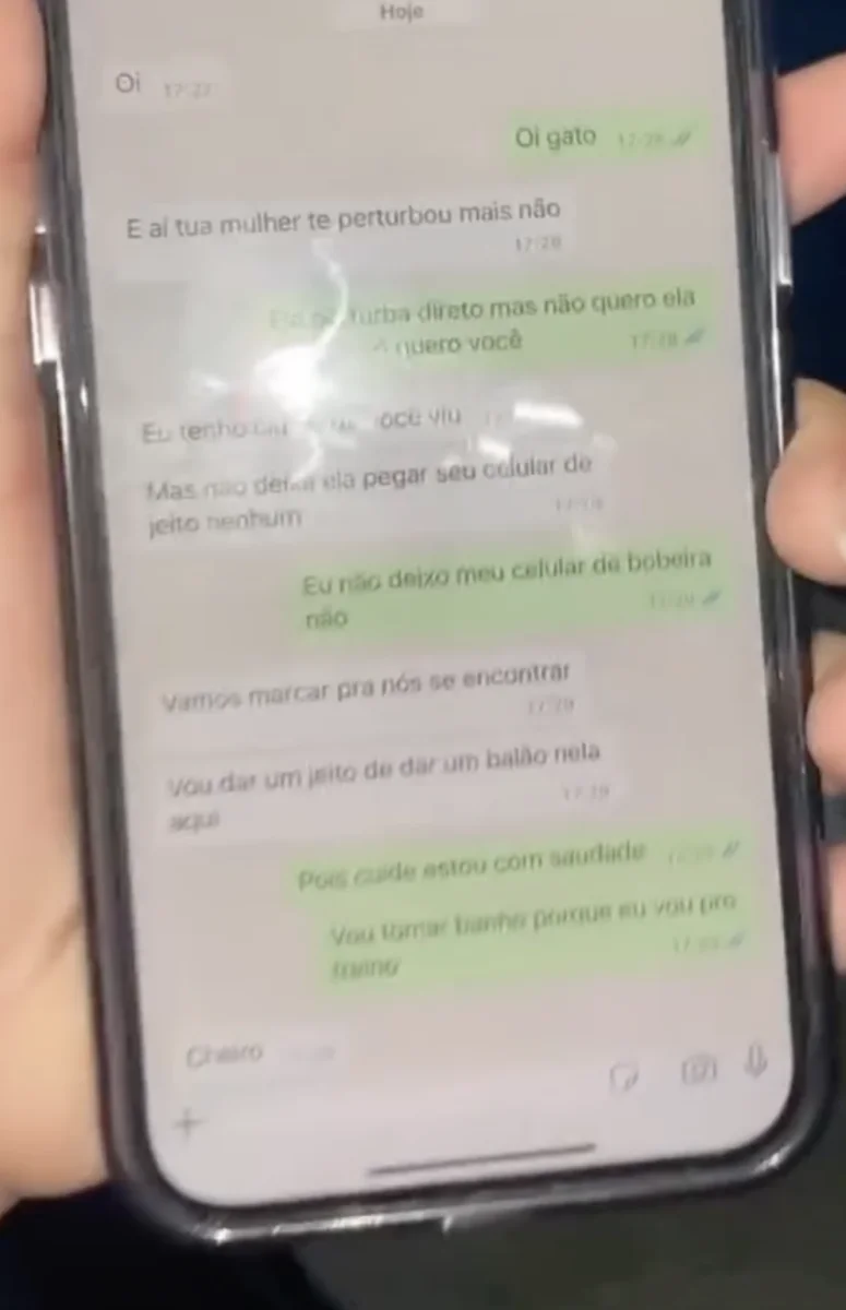 A conversa segue com tom descontraído e promessas de um novo encontro: “Pois cuide, estou com saudade. Vou tomar banho porque eu vou pro treino”, escreve o marido, em meio a erros de digitação que sugerem empolgação ou pressa. A esposa, que não teve a identidade revelada, decidiu tornar o caso público após a descoberta. No vídeo, ela aparece lendo trechos das mensagens em voz alta, enquanto o marido tenta justificar o injustificável, alegando que “não é o que parece”.