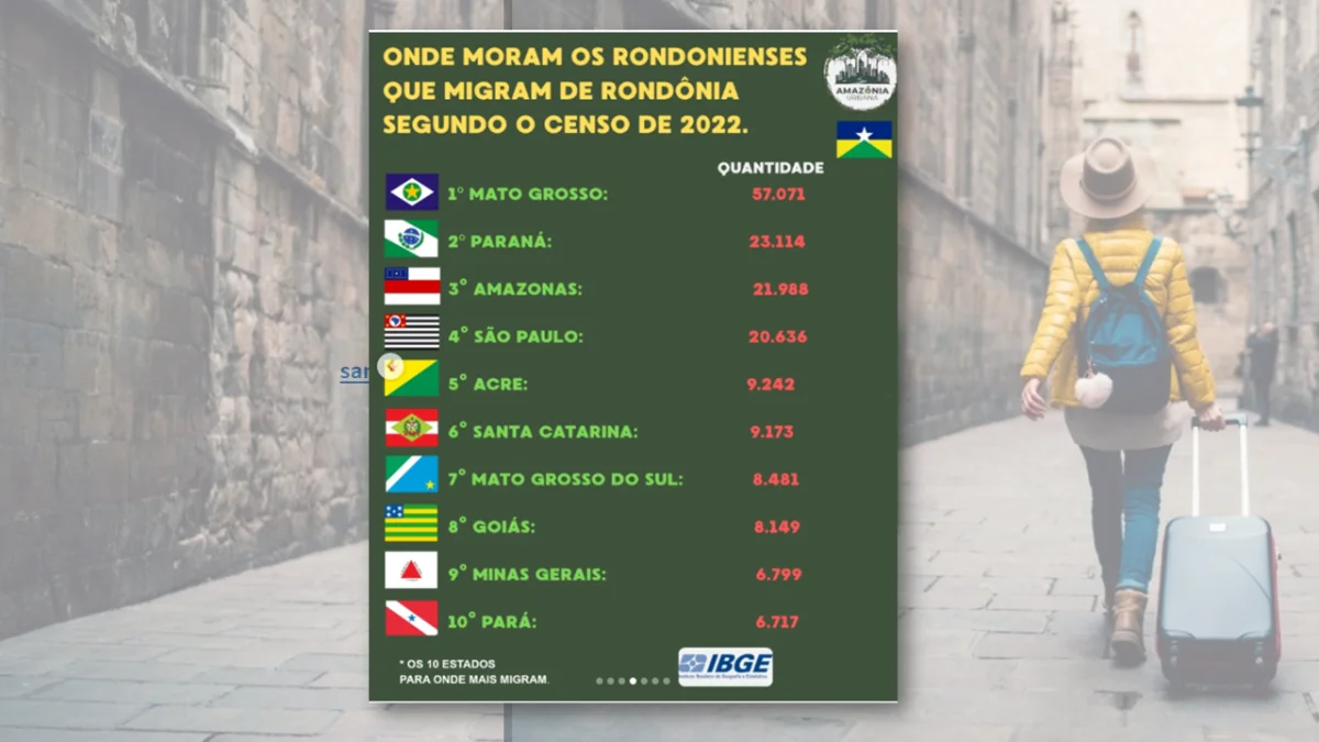 Em segundo lugar aparece o Paraná, com 23.114 rondonienses, seguido do Amazonas, que ocupa a terceira posição ao registrar 21.988 migrantes. Na quarta colocação está São Paulo, destino de 20.639 pessoas.