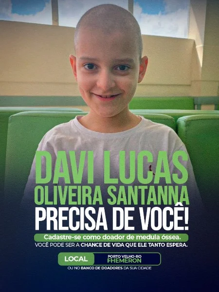 Com apenas alguns anos de idade, o pequeno Davi Lucas Oliveira Santanna, de Porto Velho, enfrenta um desafio que nenhuma criança deveria viver: a necessidade urgente de um transplante de medula óssea.