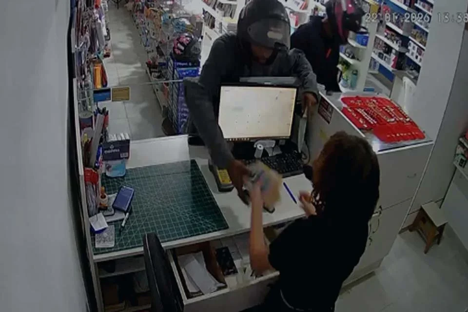 Segundo a ocorrência, dois indivíduos, ambos utilizando capacetes, invadiram o estabelecimento comercial e anunciaram o roubo. Um dos suspeitos portava uma faca do tipo peixeira, empregando grave ameaça contra a atendente. Na ação criminosa, foram subtraídos um aparelho celular da vítima e uma quantia em dinheiro que, inicialmente, foi estimada em aproximadamente R$ 17 mil. Em seguida, os autores fugiram em uma motocicleta de cor prata.