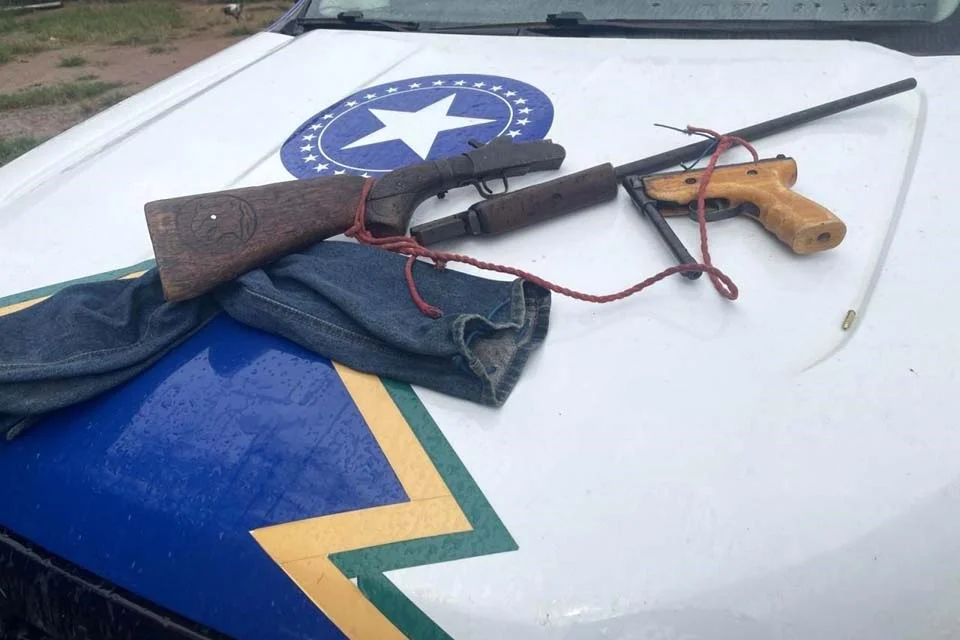 Durante a abordagem, os policiais encontraram uma garrucha de fabricação artesanal calibre .22, uma espingarda calibre .32 e 26 munições. Diante dos fatos, o agressor foi detido e encaminhado à delegacia de Ariquemes, juntamente com o armamento apreendido.