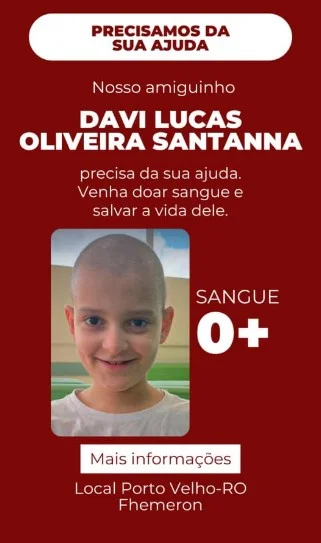 Em um gesto comovente, o pequeno gravou um vídeo pedindo a solidariedade das pessoas. Neste momento, Davi precisa urgentemente de doação de sangue do tipo O positivo (O+) para continuar seu tratamento.