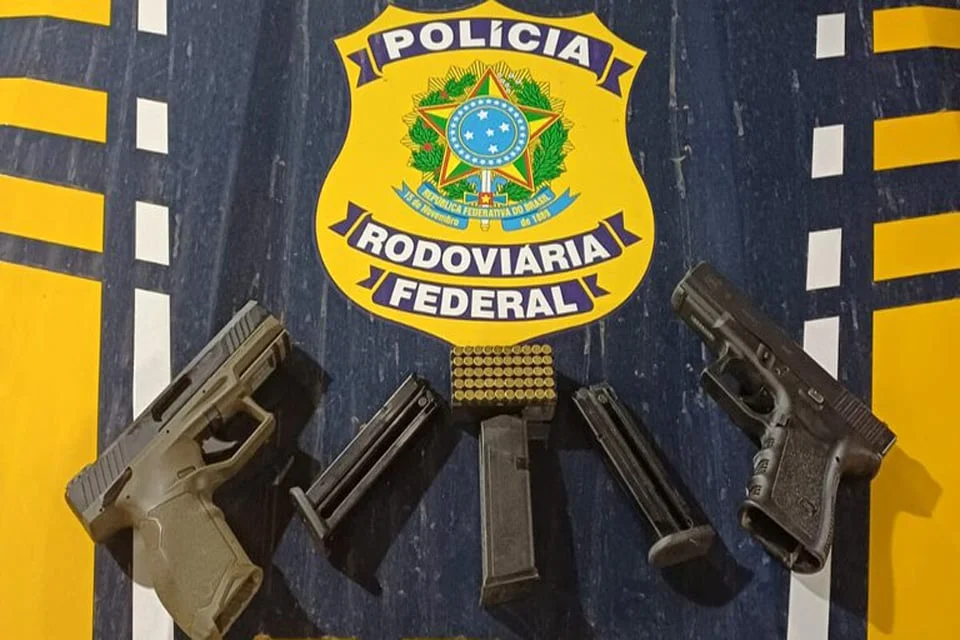 Durante a busca veicular, foi localizada uma pistola calibre 9 mm sobre o tapete do passageiro, além de um carregador municiado, com 13 (treze) munições de mesmo calibre, no console central. O condutor, registrado como CAC, confirmou possuir o armamento e declarou que, além da pistola Glock, transportava uma pistola calibre 22, dois carregadores vazios, uma caixa com 50 munições do mesmo calibre, além de uma bolsa contendo 27 munições diversas.