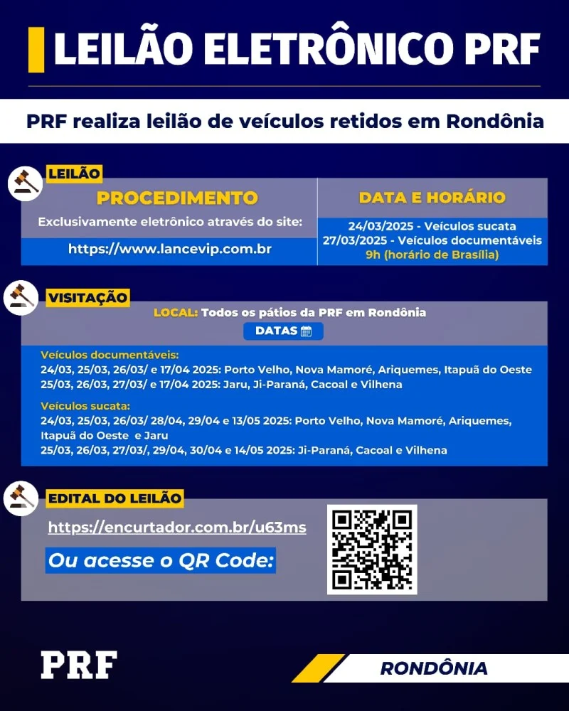 A Polícia Rodoviária Federal (PRF) realizará um leilão eletrônico de veículos retidos no estado de Rondônia. O evento será realizado exclusivamente pela internet, através do site www.lancevip.com.br, e contará com veículos classificados como sucata e documentáveis.