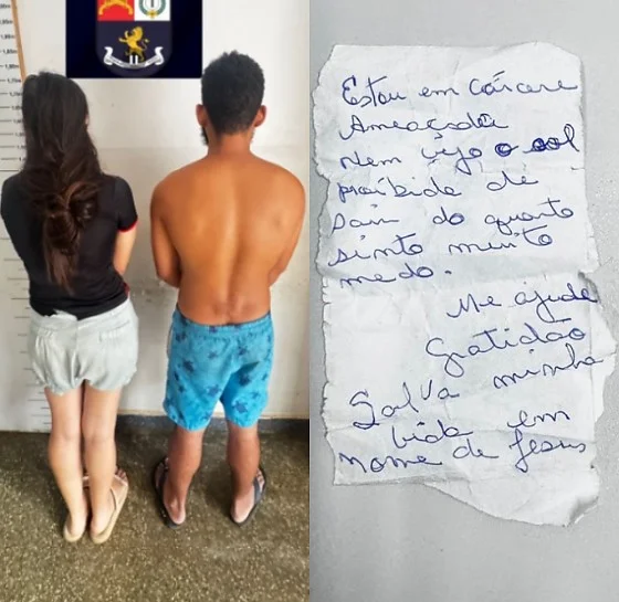 Em certo momento, um dos policiais observou a vítima abraçada com a testemunha e tentando colocar discretamente um papel no bolso de sua camisa. O bilhete continha o pedido de socorro: “Estou em cárcere e ameaçada. Nem vejo o sol. Proibida de sair do quarto. Sinto muito medo. Me ajuda. Gratidão. Salva a minha vida em nome de Jesus”.