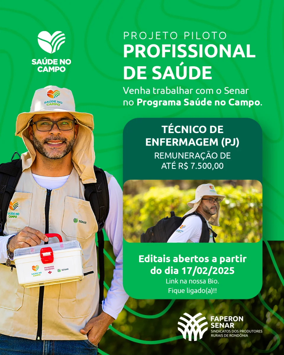 O SENAR Rondônia está com edital aberto para credenciamento de Pessoas Jurídicas para compor o cadastro de prestadores de serviços no Programa Saúde no Campo. O objetivo é viabilizar atendimento a trabalhadores e produtores rurais e seus familiares, por meio de ações de promoção da saúde e prevenção de doenças.