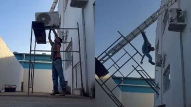 Técnico de ar-condicionado sofre queda durante instalação e registra acidente em vídeo. VEJA