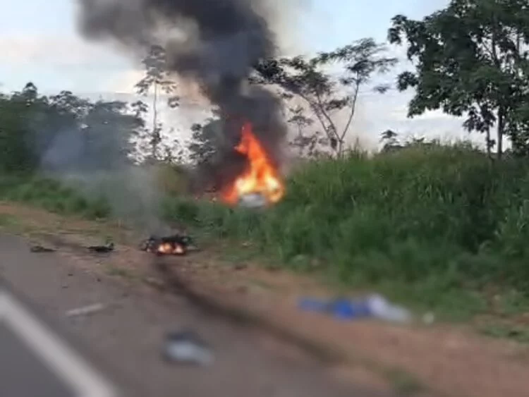 Com a força da batida, o veículo pegou fogo e foi totalmente consumido pelas chamas, atraindo a atenção de motoristas que passavam pela rodovia.