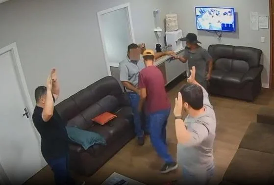 Nas imagens, é possível ver dois assaltantes armados entrando em uma sala e rendendo as vítimas. Um dos criminosos revistou os bolsos dos rapazes, enquanto o comparsa deu uma coronhada na cabeça de outro homem que estava sentado no sofá. Após o crime, eles fugiram.