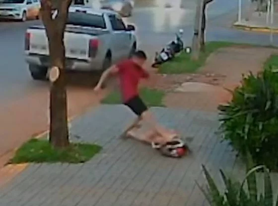 O agressor segue perseguindo a vítima e arremessa outra pedra contra ela. A vítima cai no chão e é agredida violentamente com um chute na região da cabeça. Na sequência ele puxa a mulher pelos cabelos.