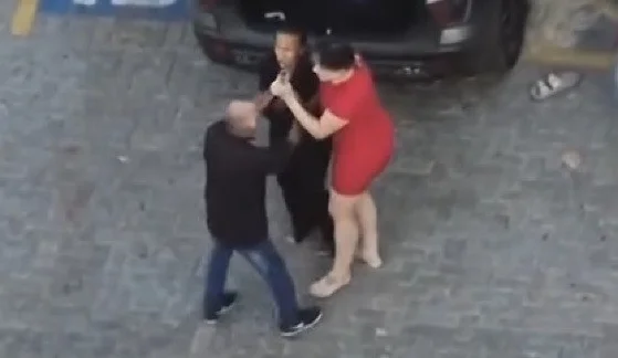 Os três chegam a cair no chão. A reportagem apurou que a Polícia Militar não foi acionada sobre a confusão.