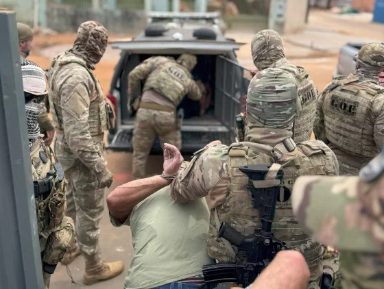 Nas imagens é possível ver os bandidos algemados, sendo colocados na viatura. Eles foram encontrados em uma casa no município de Vilhena (RO).